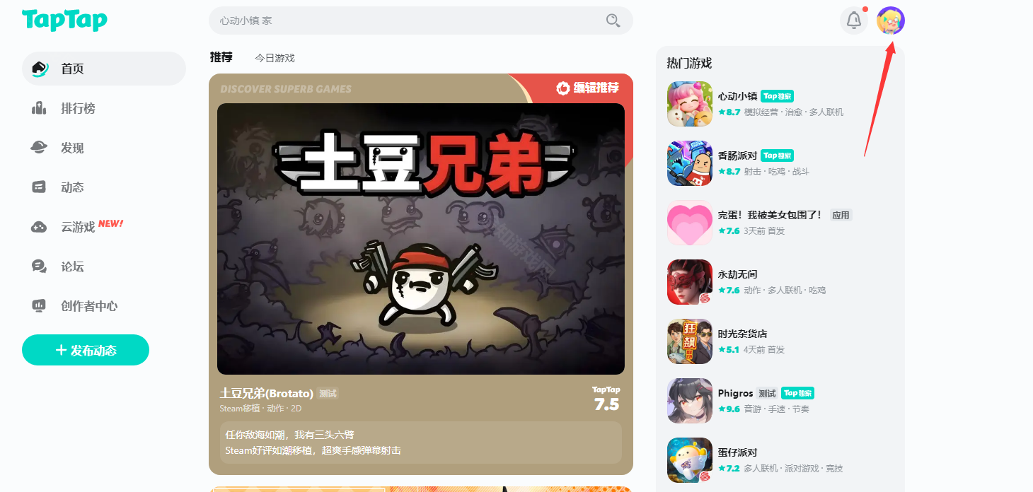 1. 访问官网 https://www.taptap.cn/ 并登录账号,点击右上角头像;
